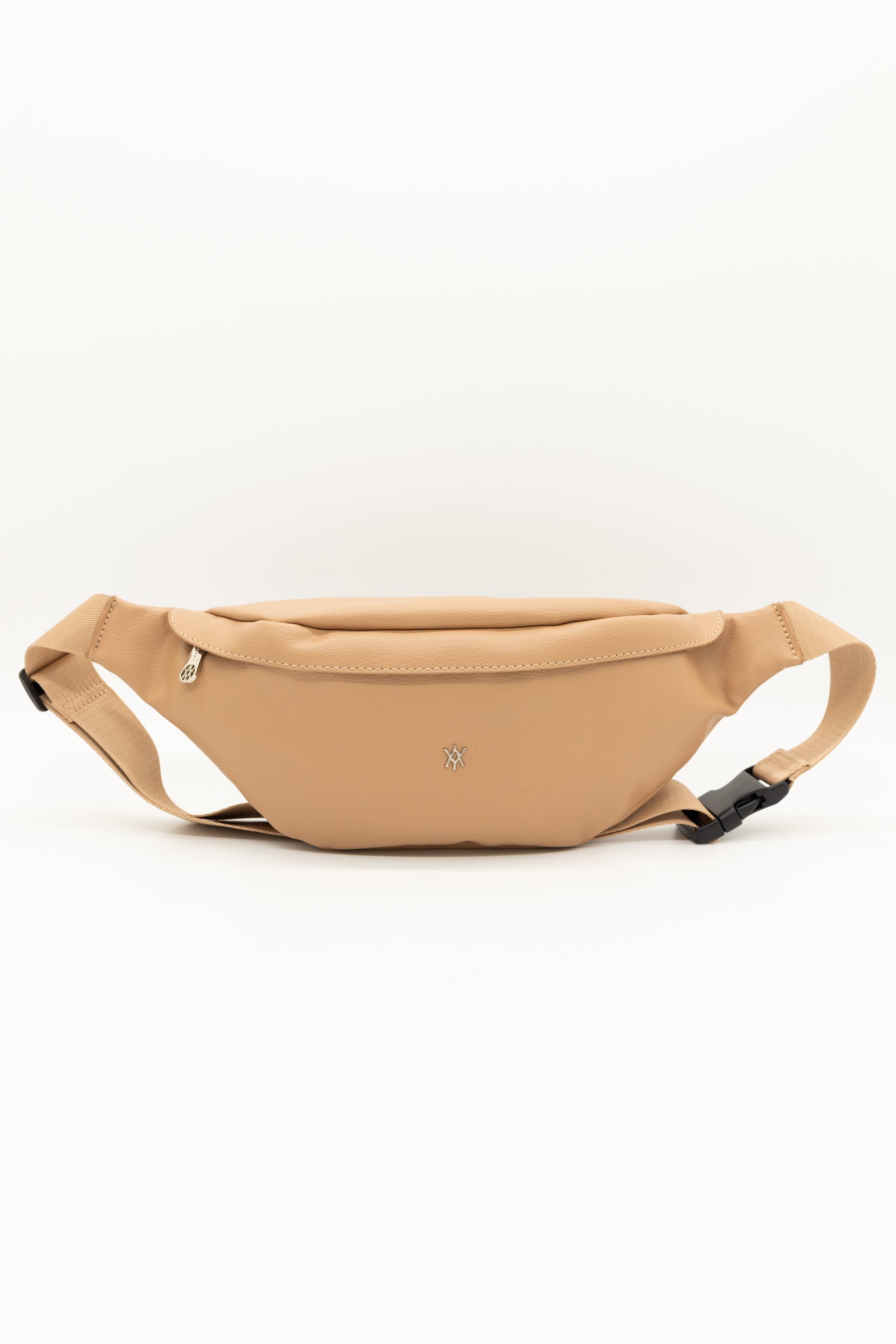 Su logo metálico frontal y correa ajustable lo convierten en un accesorio moderno, cómodo y versátil para usar cruzado o en la cintura.
