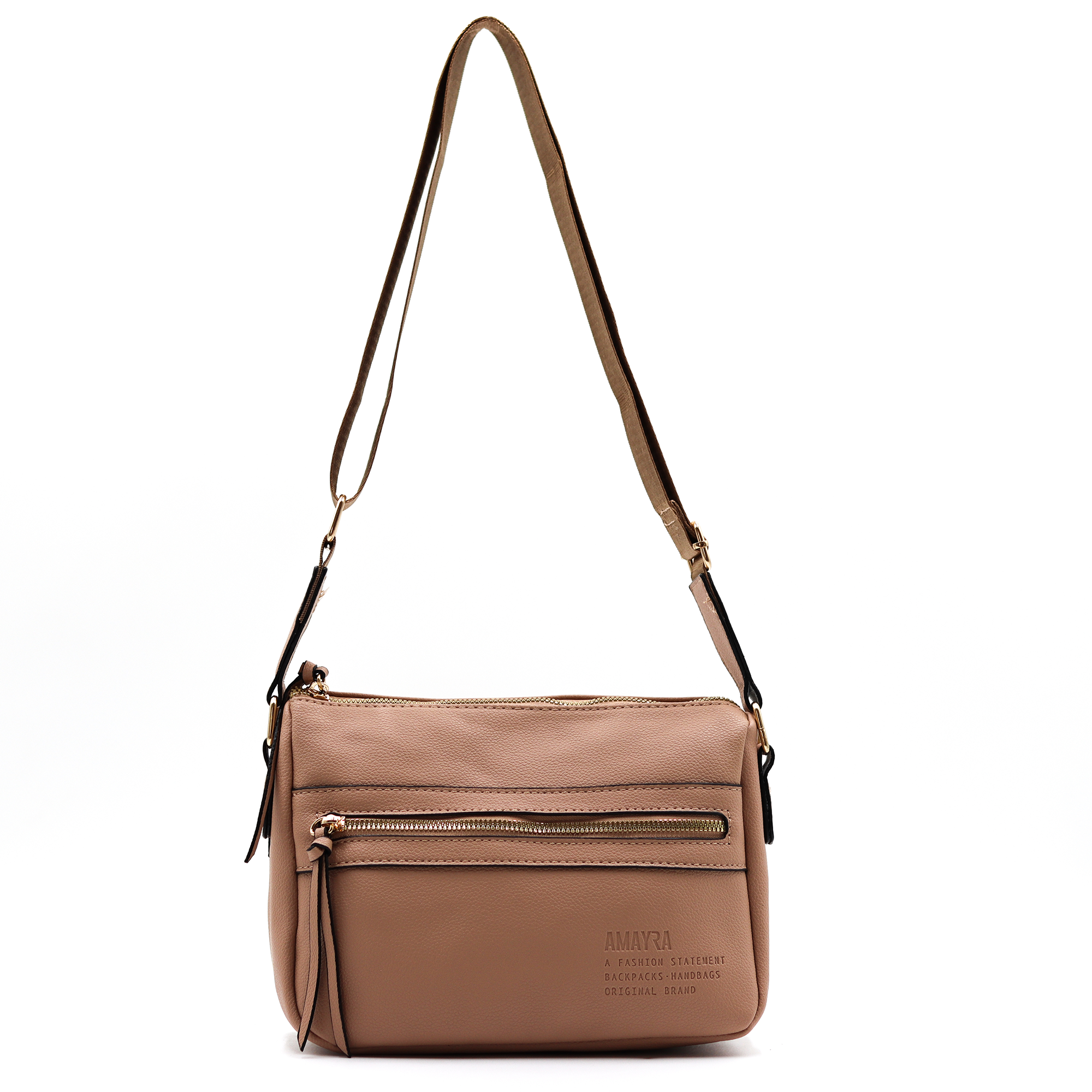 Bandolera con un compartimento principal con cierre, dos bolsillos interiores, uno con cierrre, y un bolsillo con cierre en la parte delantera. Correa ajustable.