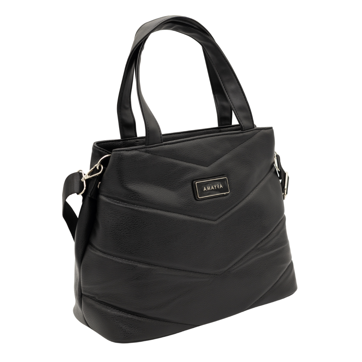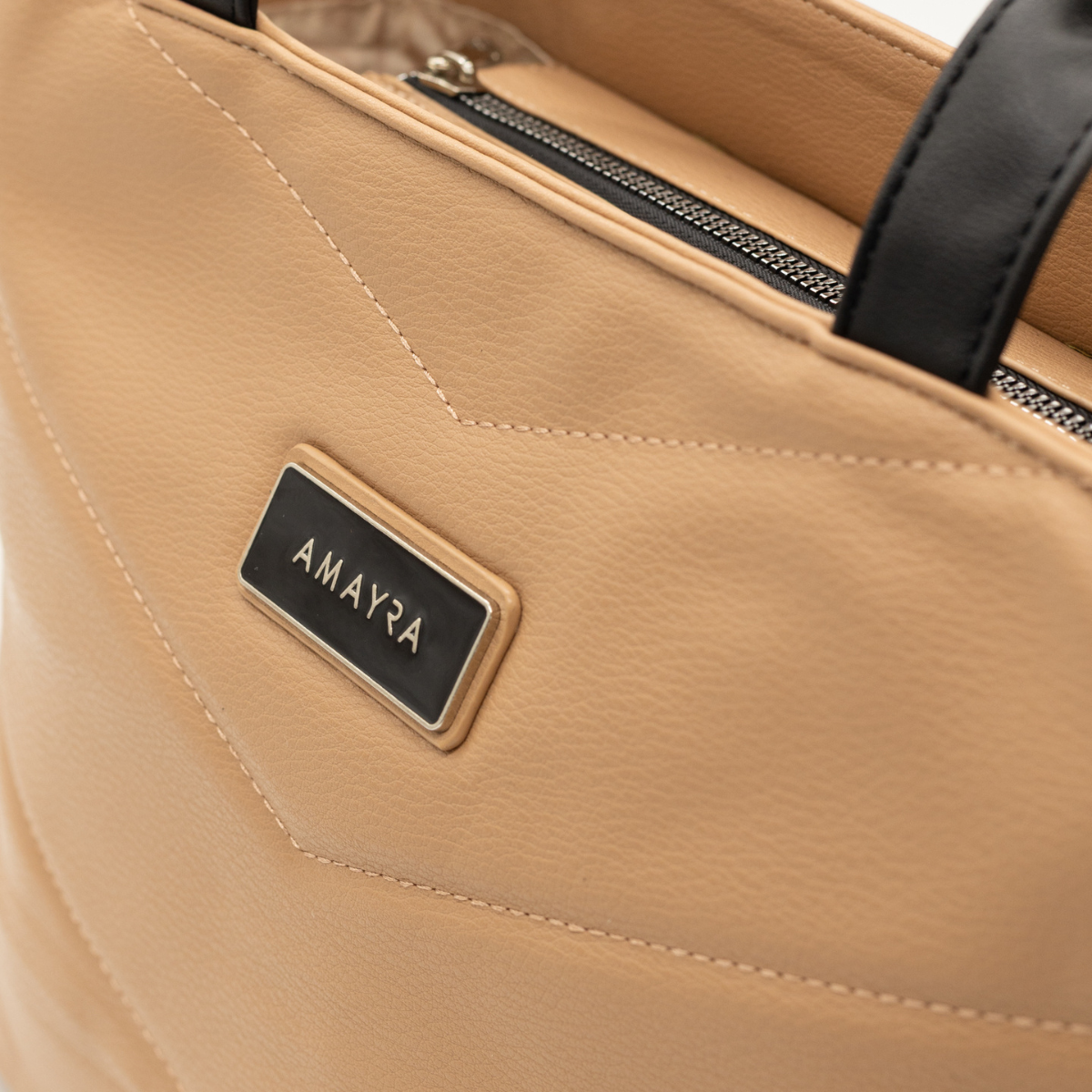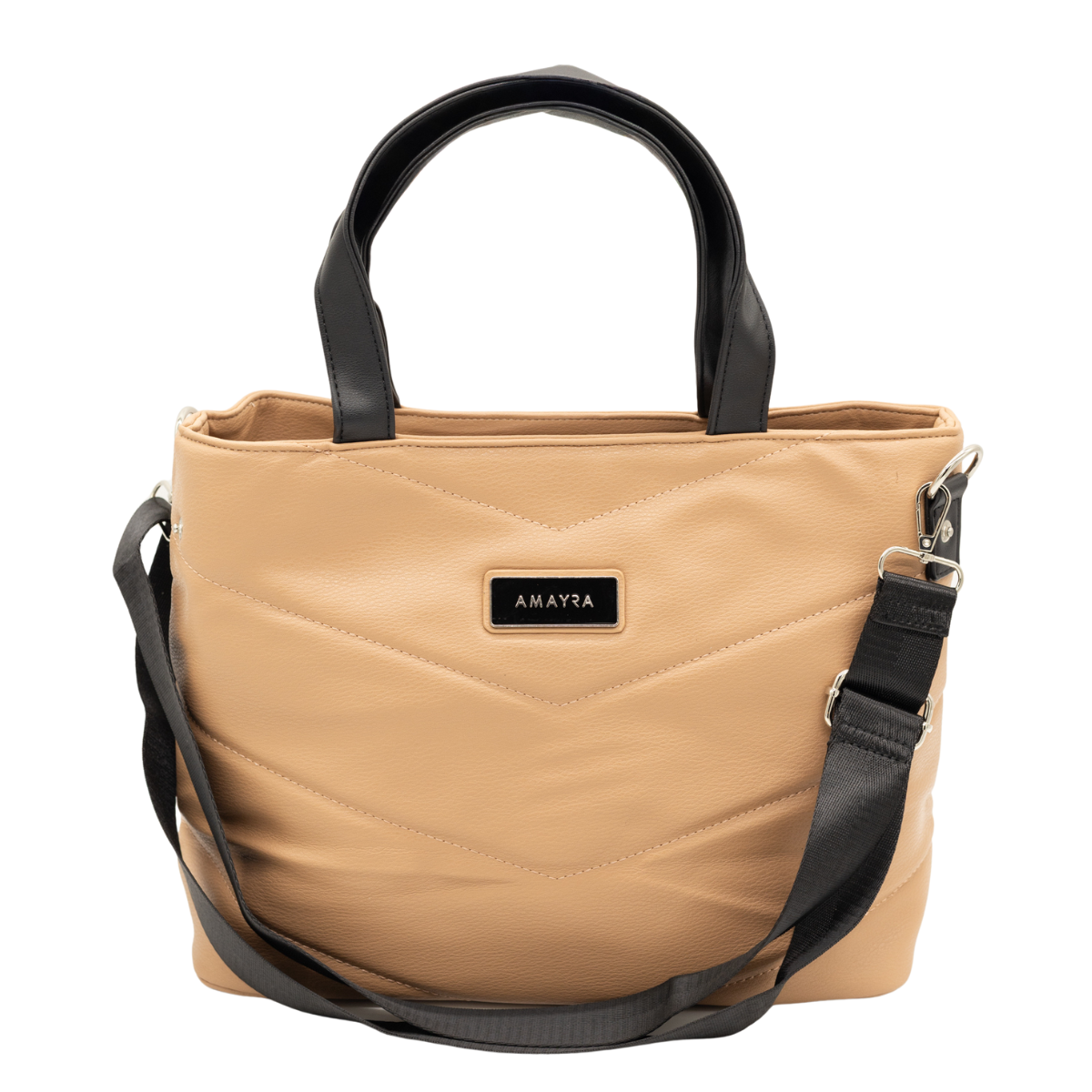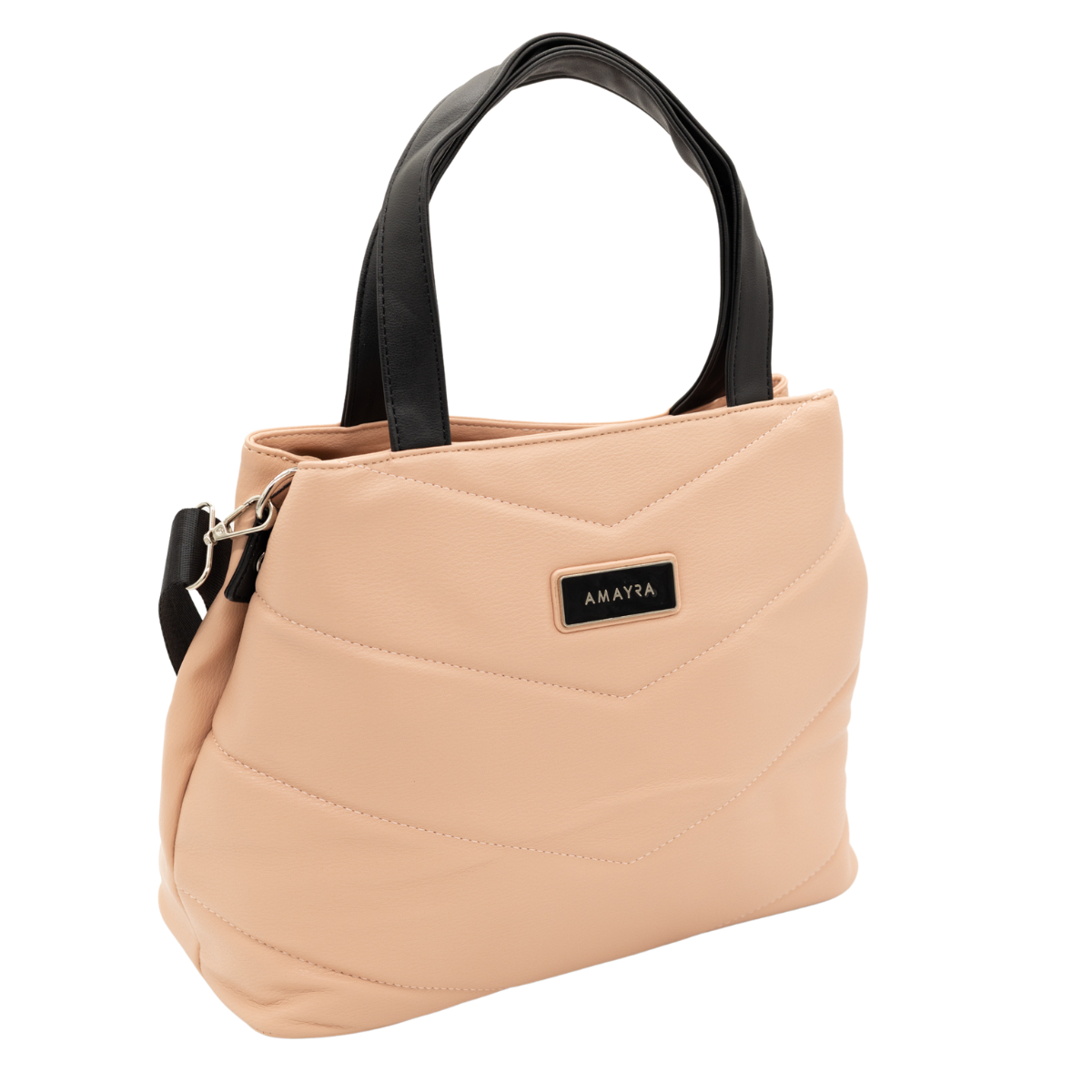 Cartera con un compartimento principal amplio con cierre y bolsillos interiores y trasero con cierre, ideales para mantener tus pertenencias seguras y organizadas. Su diseño acolchado con patrón en “V” y asas bicolor aportan un toque moderno y versátil, perfecto tanto para el día a día como para la oficina.