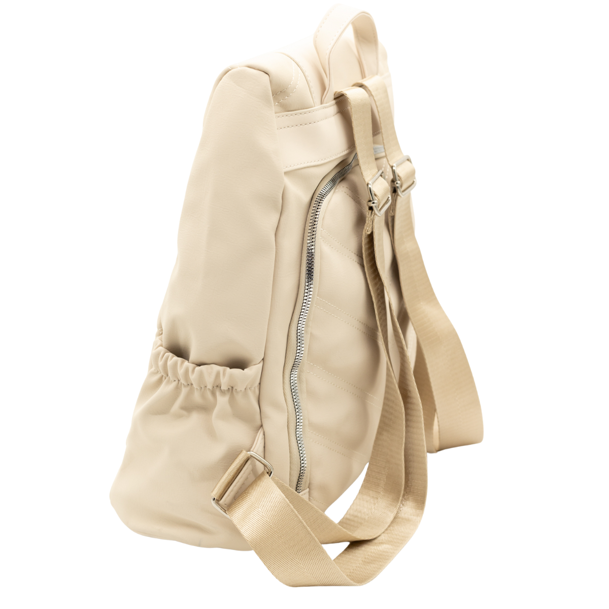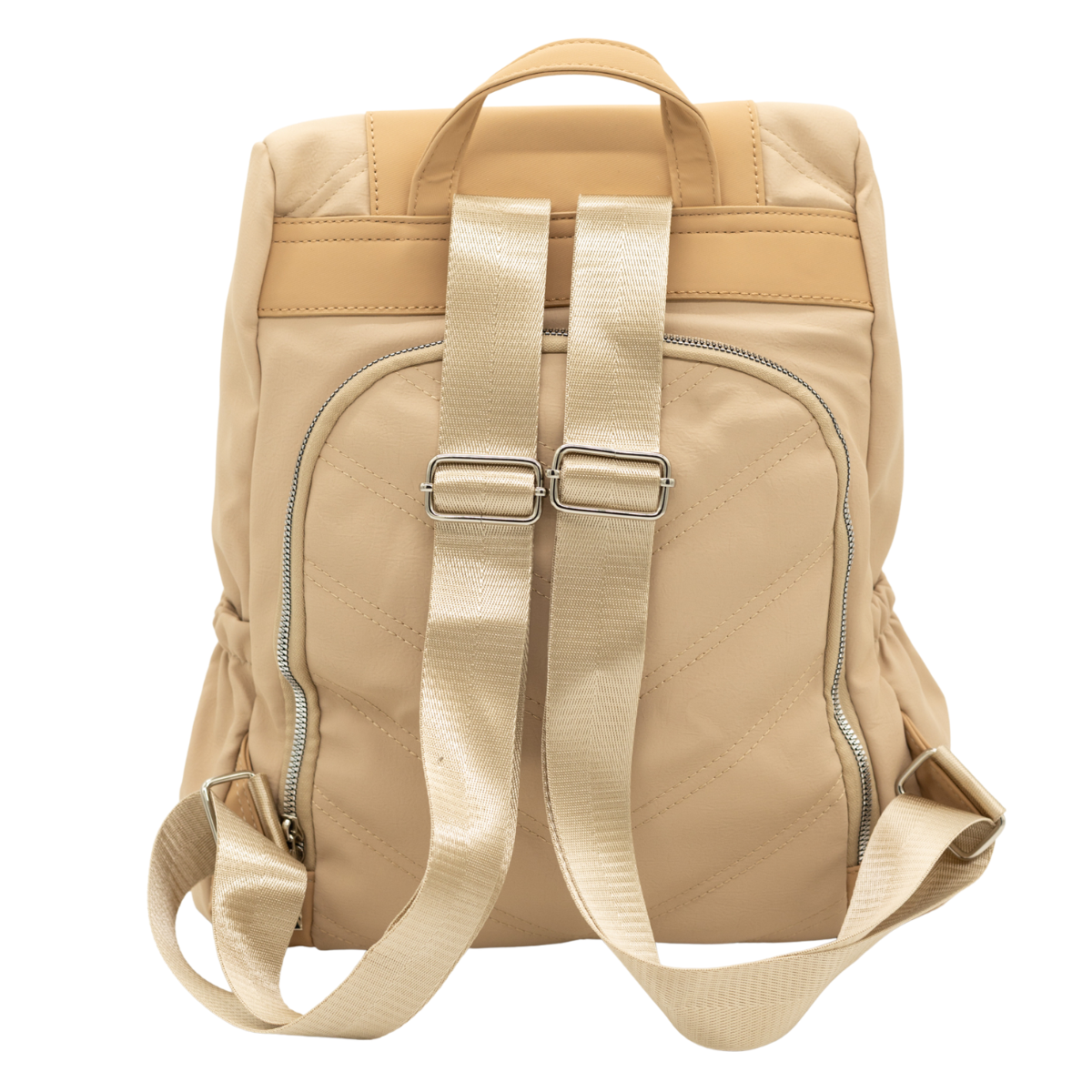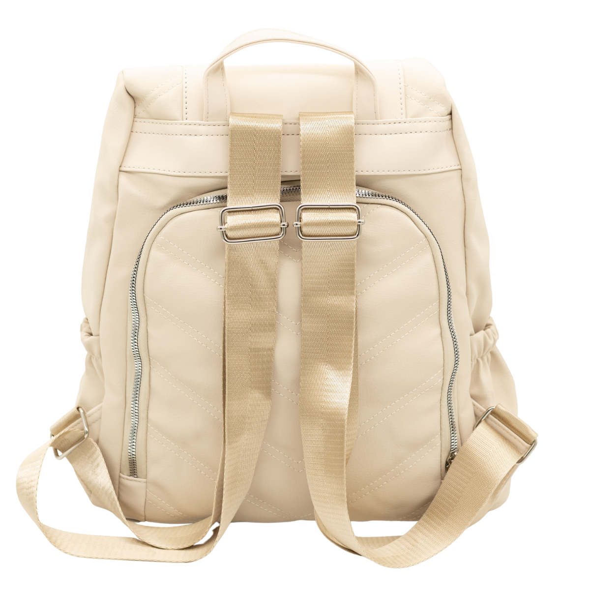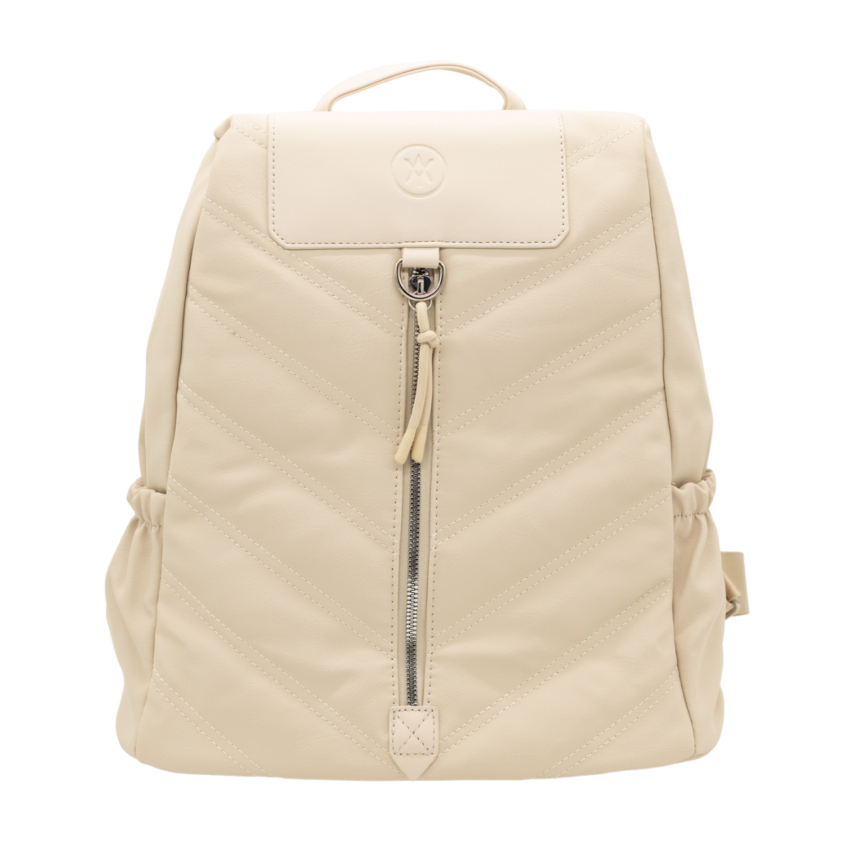 Mochila Antirobo con un compartimento principal con cierre en la parte trasera, bolsillo frontal con cierre vertical y dos bolsillos laterales elásticos para botella o accesorios. Su acabado acolchado con costuras diagonales le da un estilo contemporáneo y elegante.