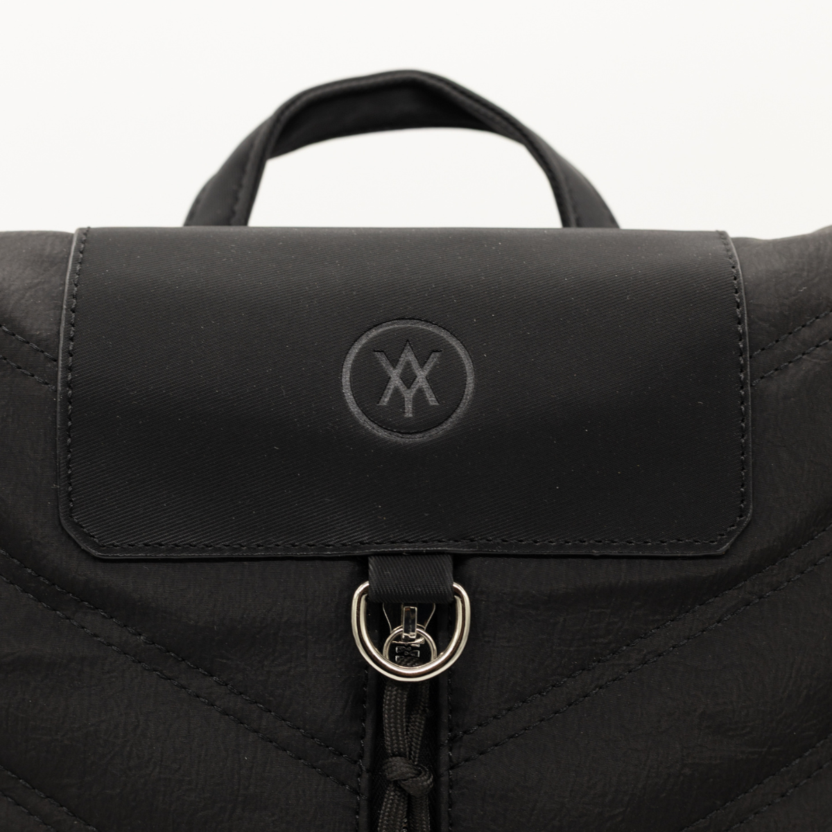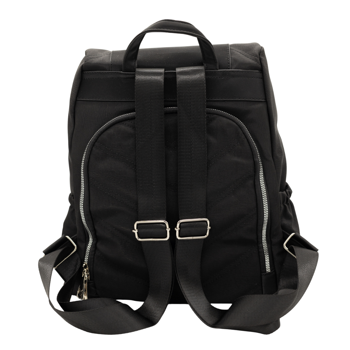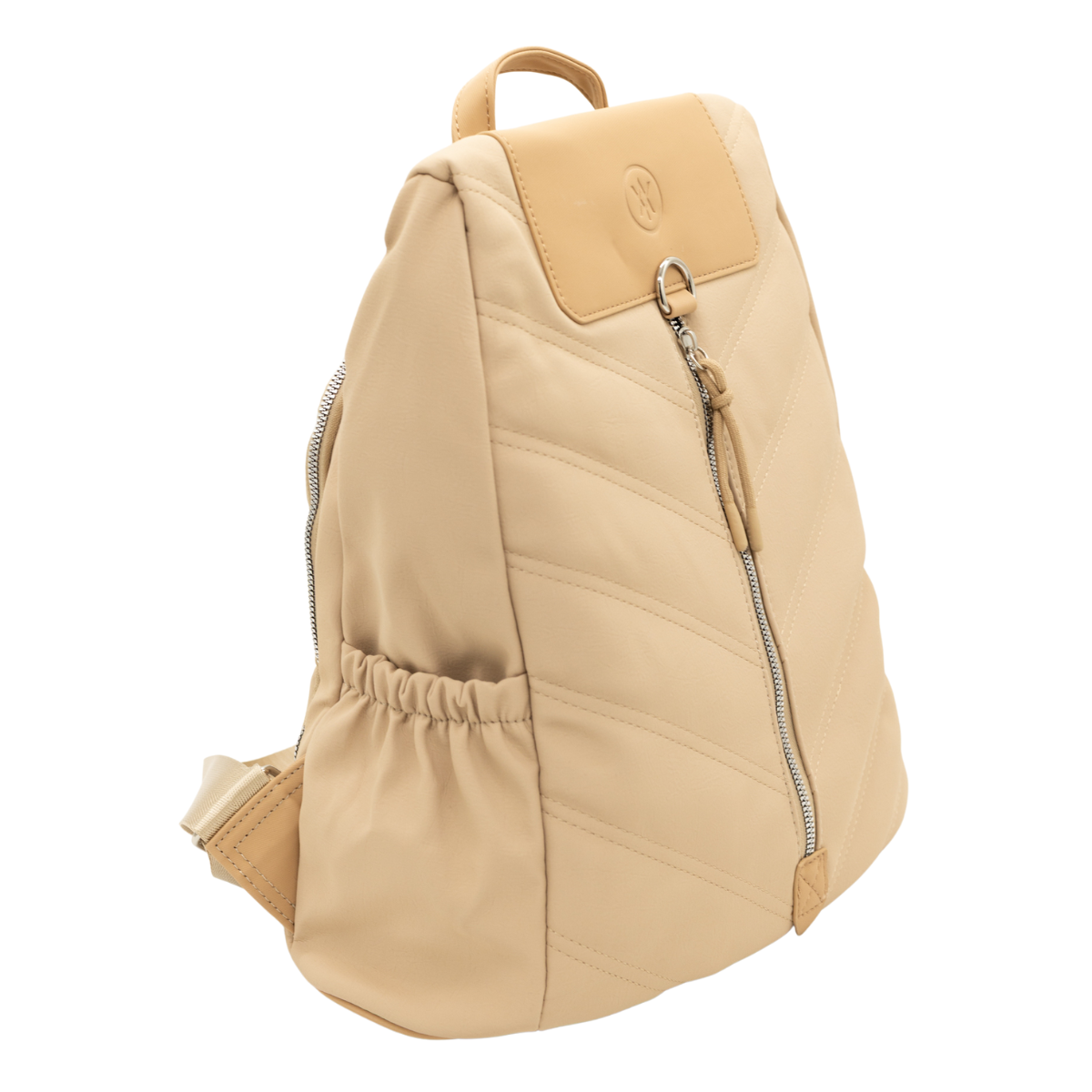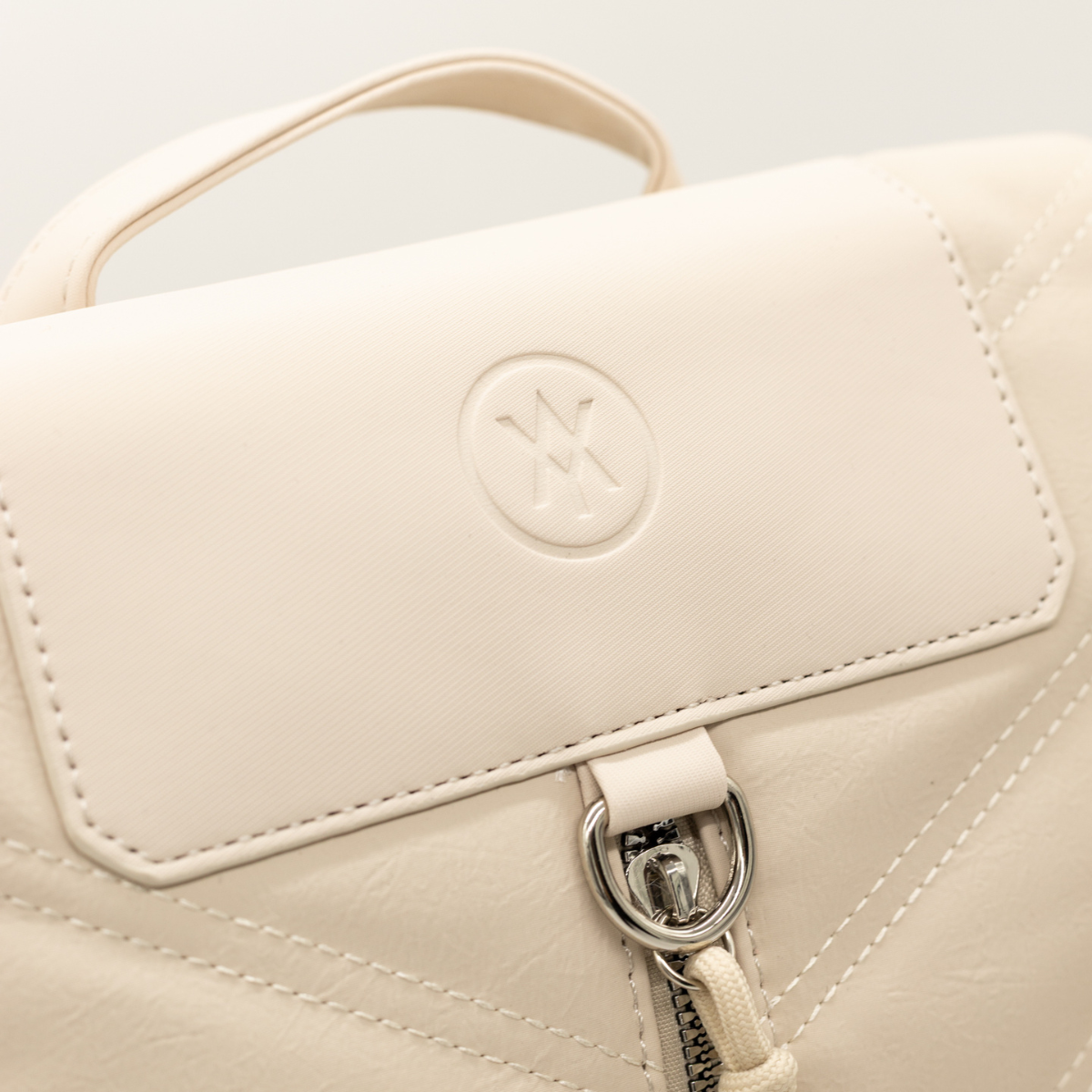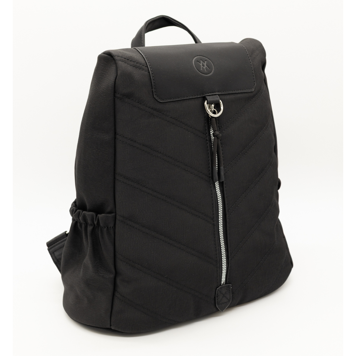 Mochila Antirobo con un compartimento principal con cierre en la parte trasera, bolsillo frontal con cierre vertical y dos bolsillos laterales elásticos para botella o accesorios. Su acabado acolchado con costuras diagonales le da un estilo contemporáneo y elegante.