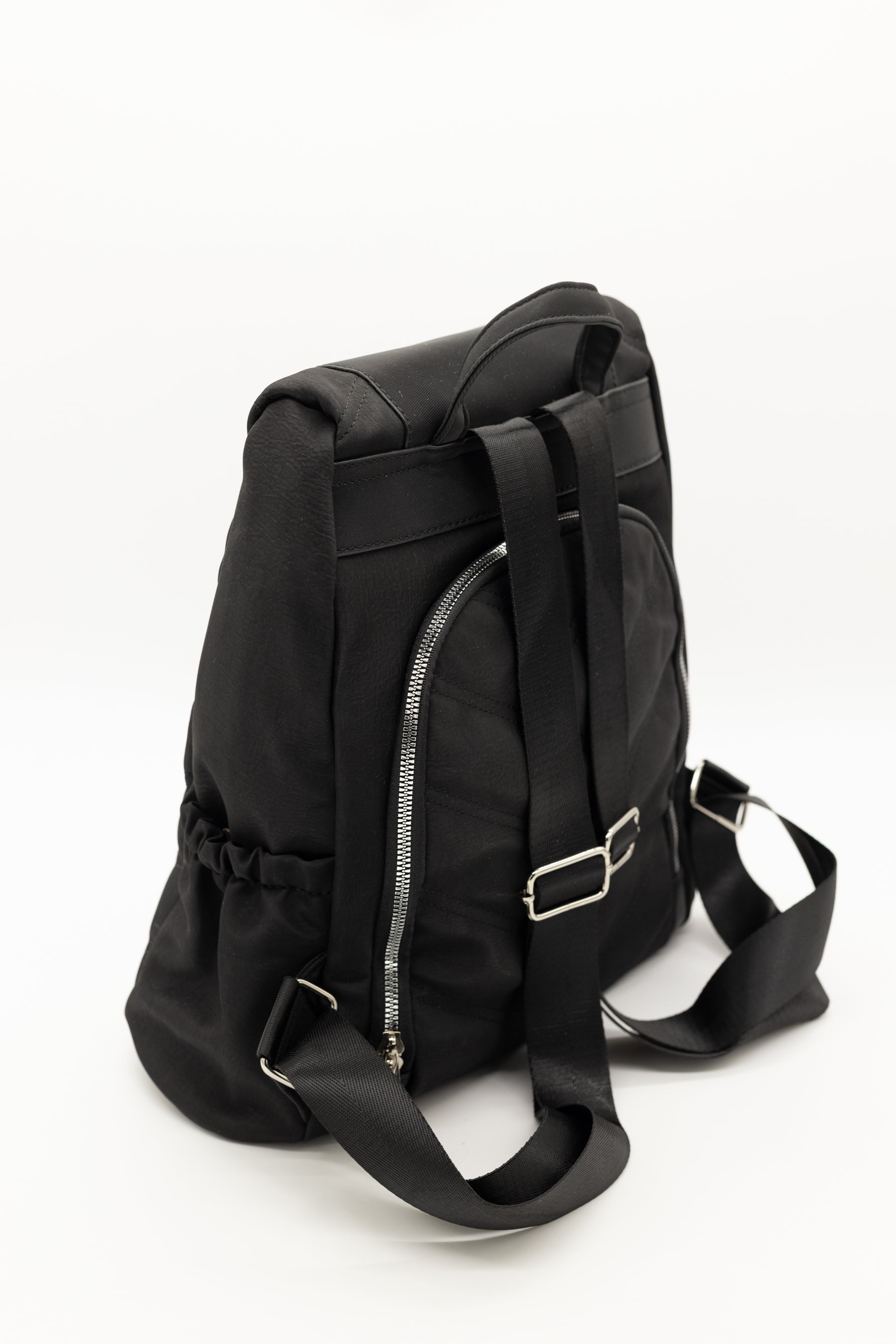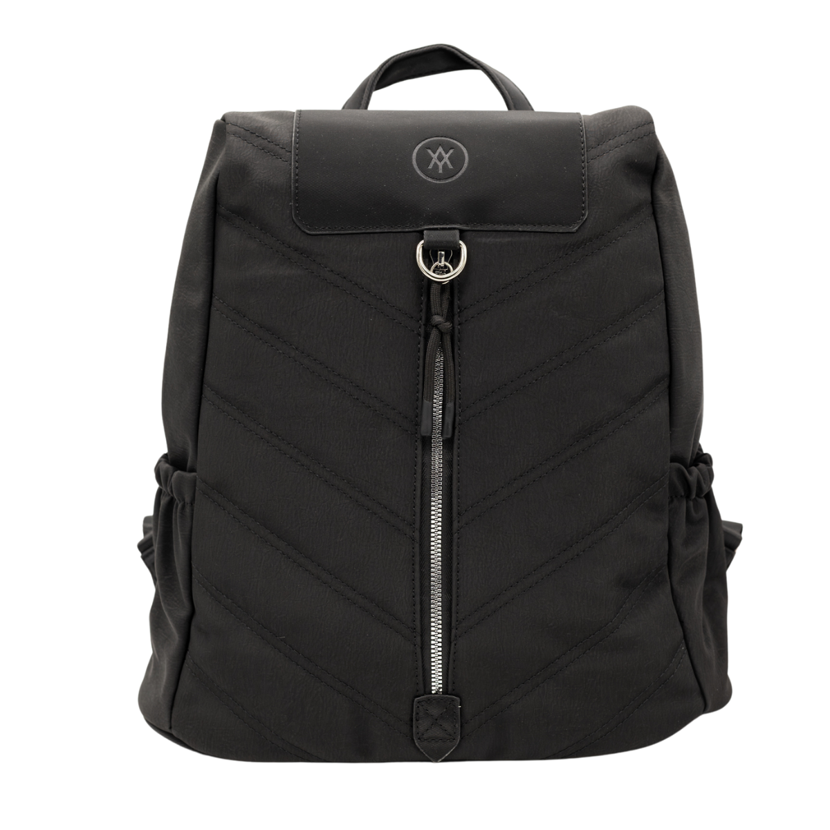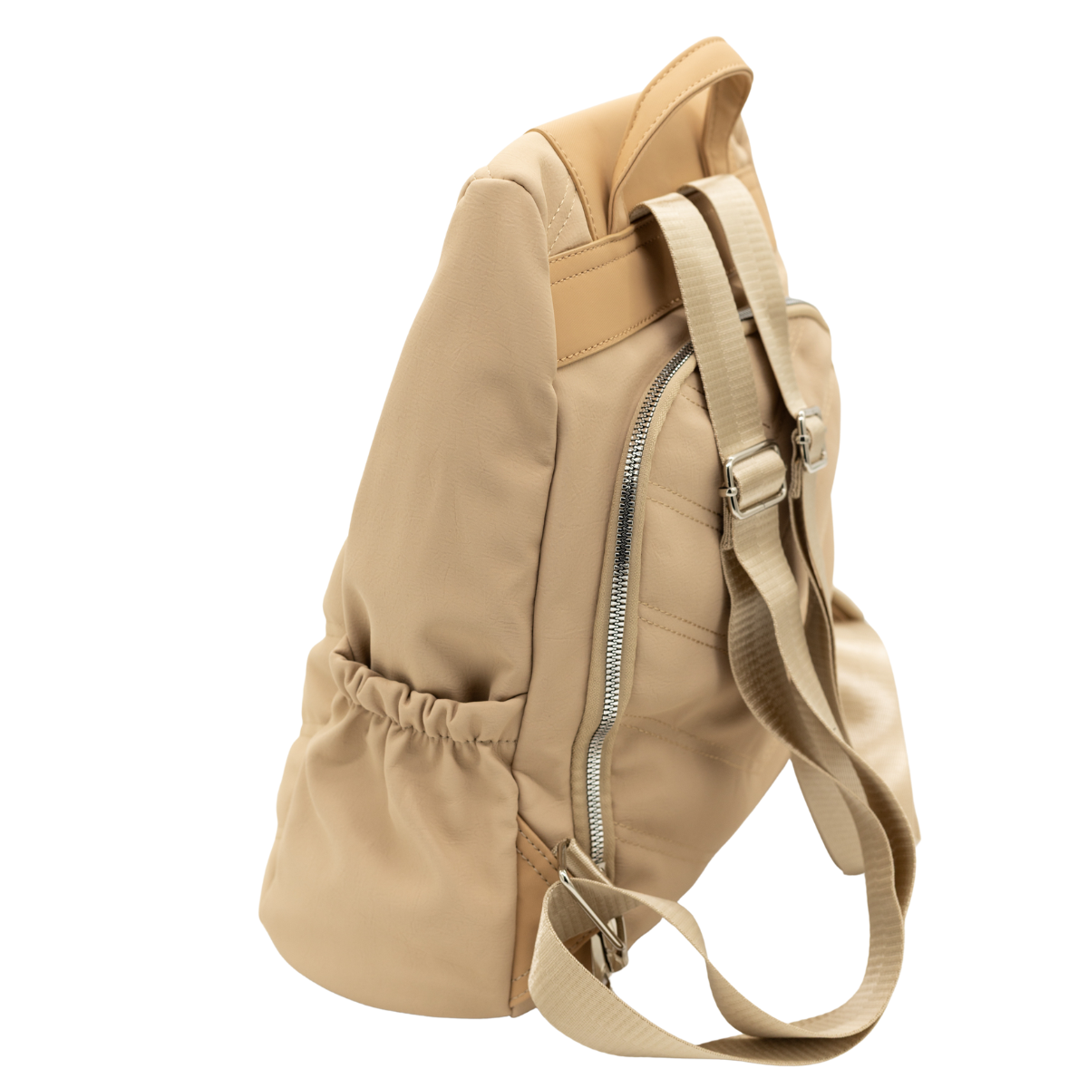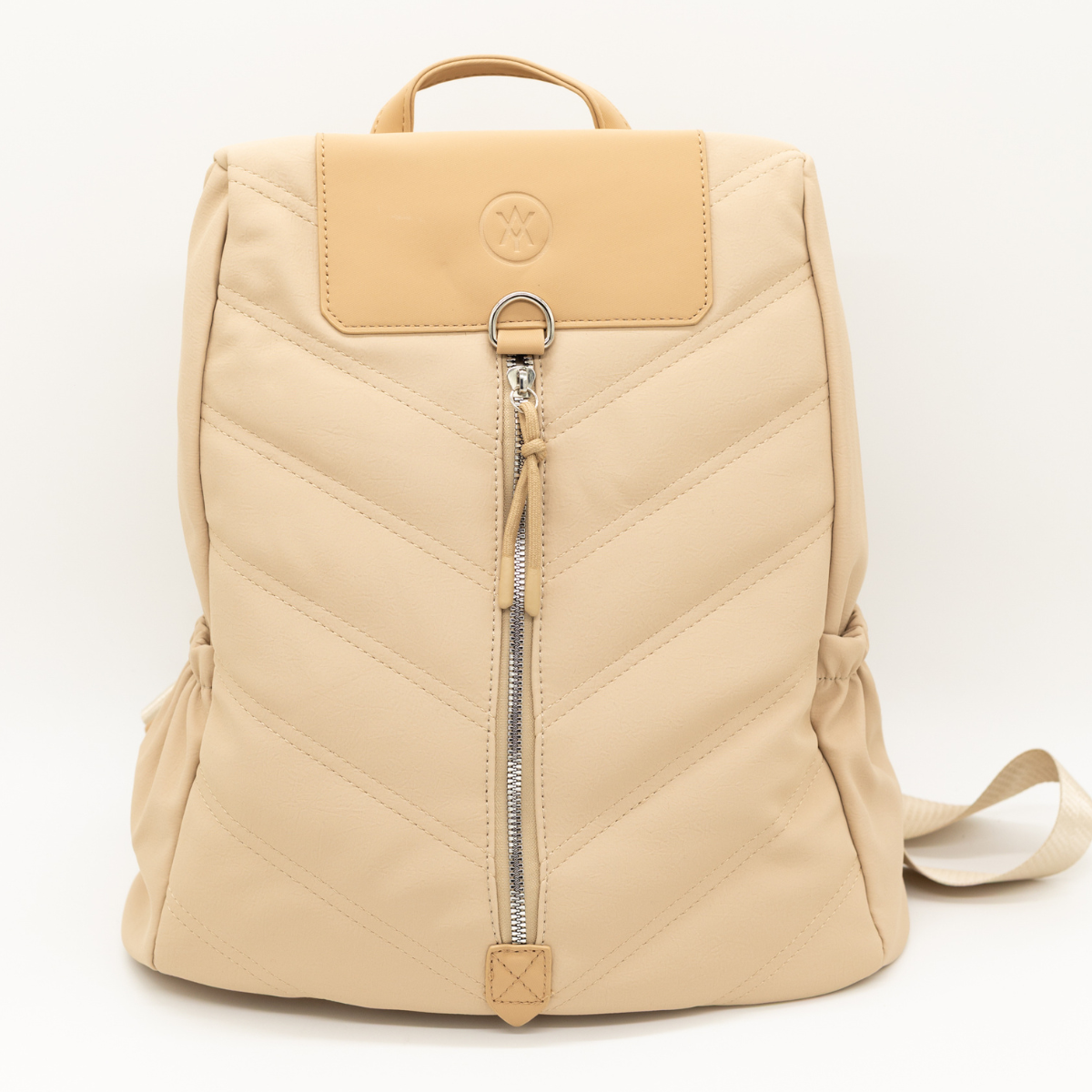 Mochila Antirobo con un compartimento principal con cierre en la parte trasera, bolsillo frontal con cierre vertical y dos bolsillos laterales elásticos para botella o accesorios. Su acabado acolchado con costuras diagonales le da un estilo contemporáneo y elegante.
