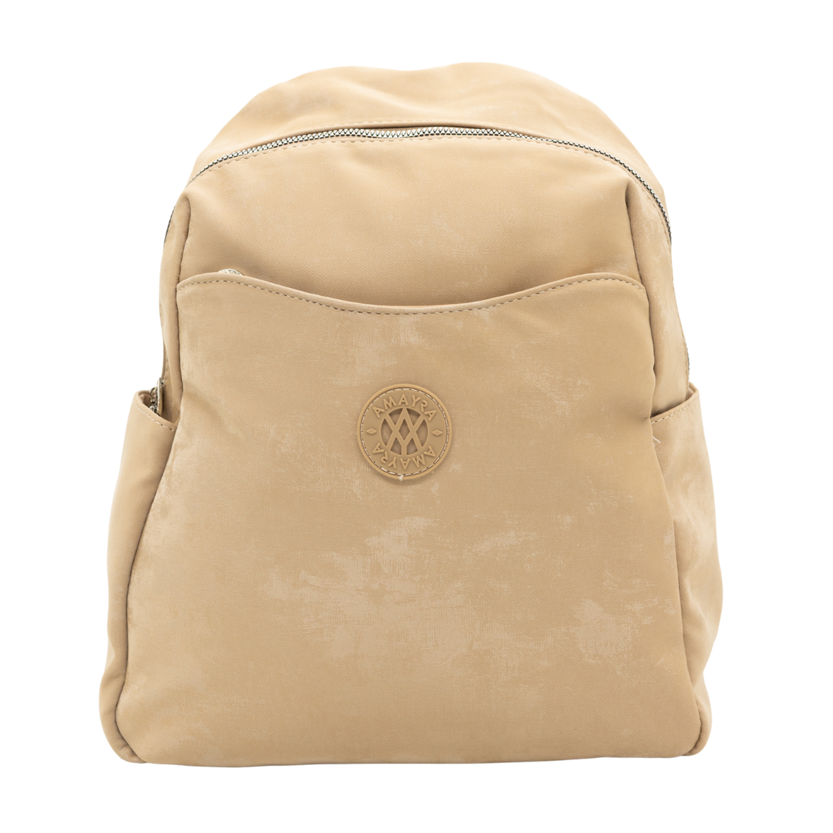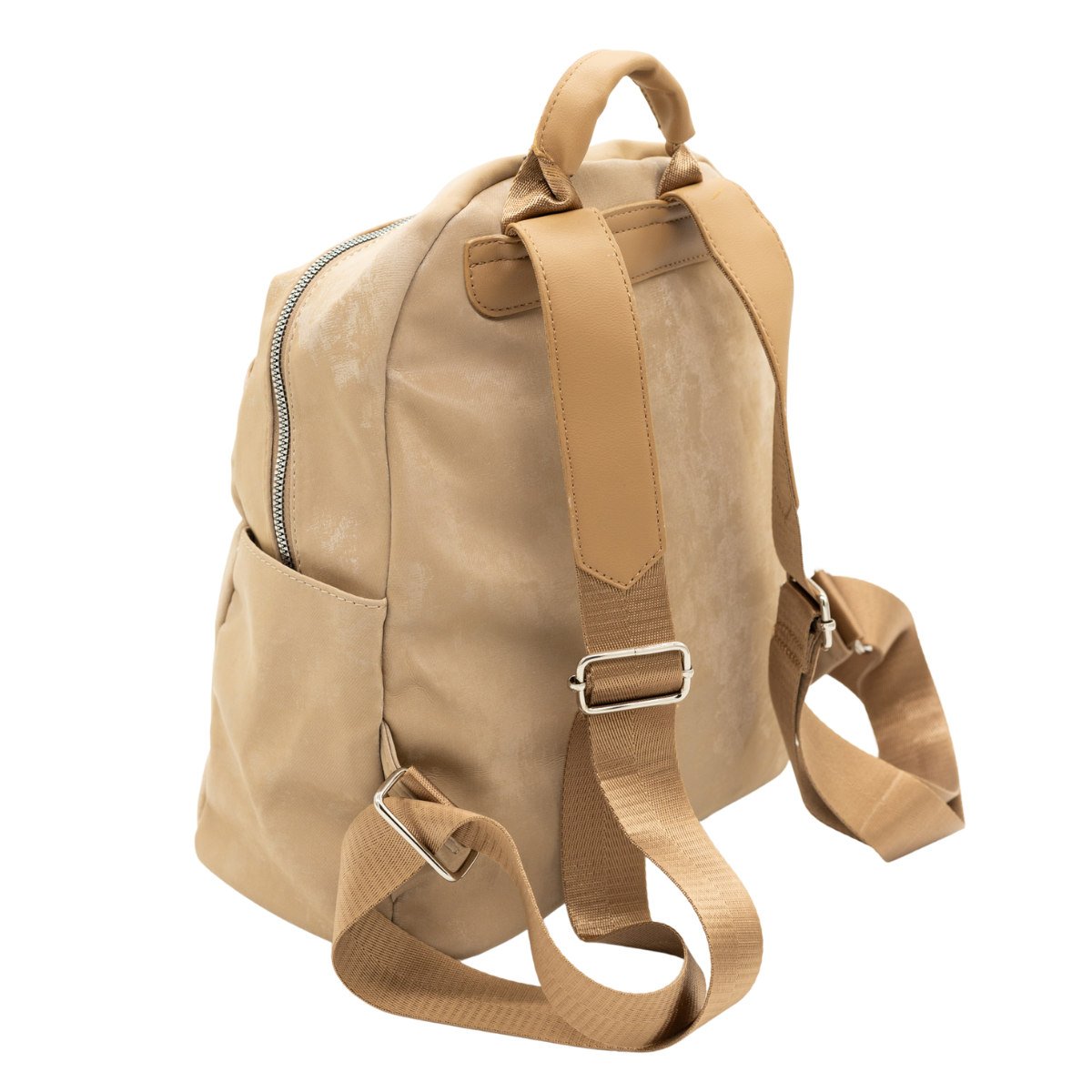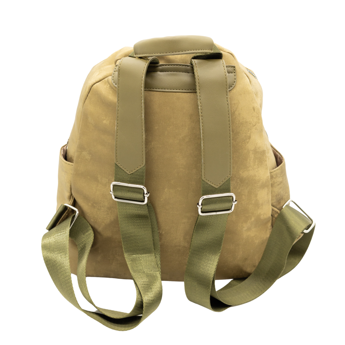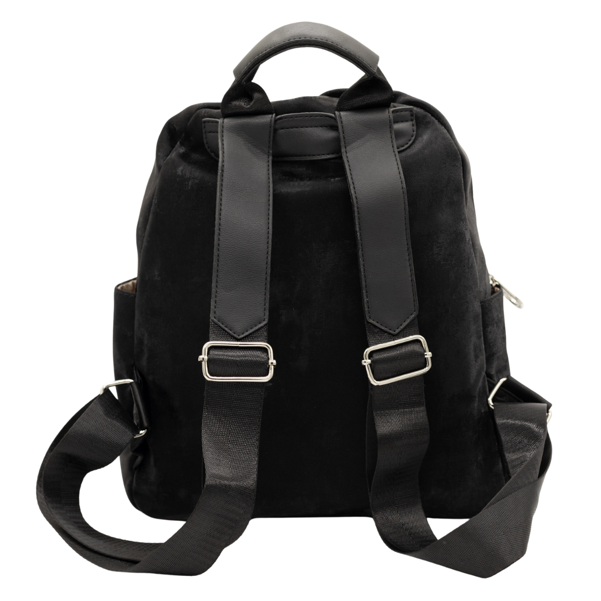 Mochila con amplio compartimento principal con cierre superior, bolsillo frontal exterior, dos bolsillos laterales abiertos. Las correas ajustables y el asa superior permiten llevarla cómodamente al hombro o en la mano. Diseño moderno con acabado efecto aterciopelado y textura metalizada suave. Su estructura liviana y práctica la hace ideal para uso diario.