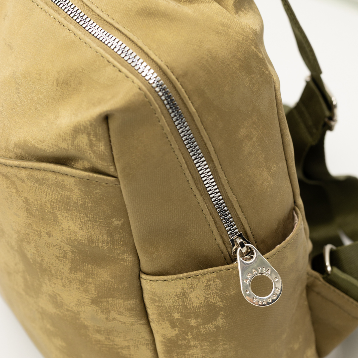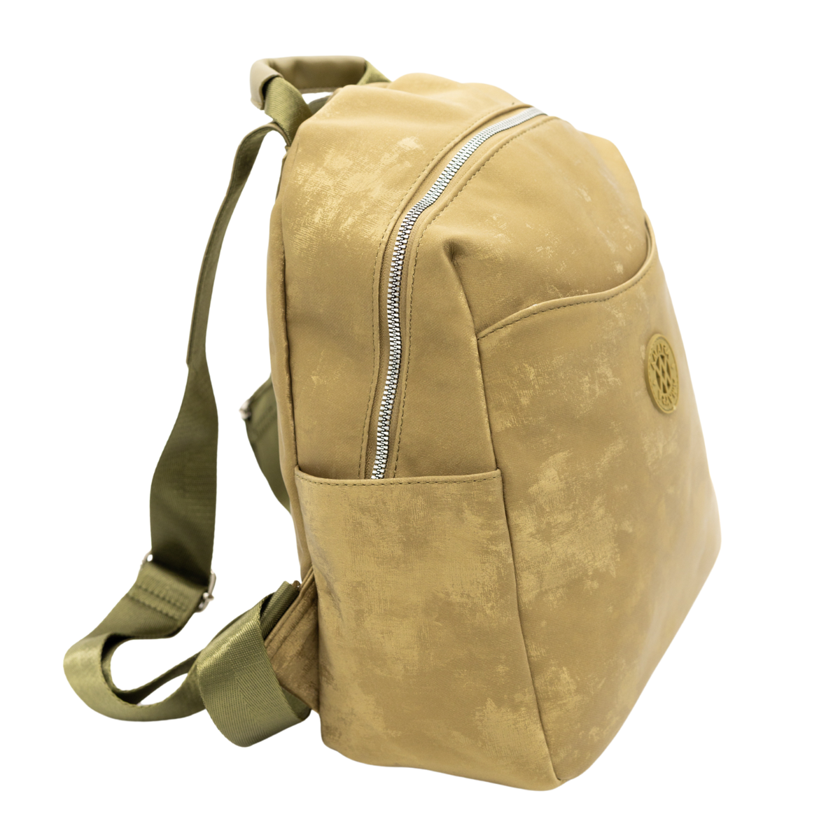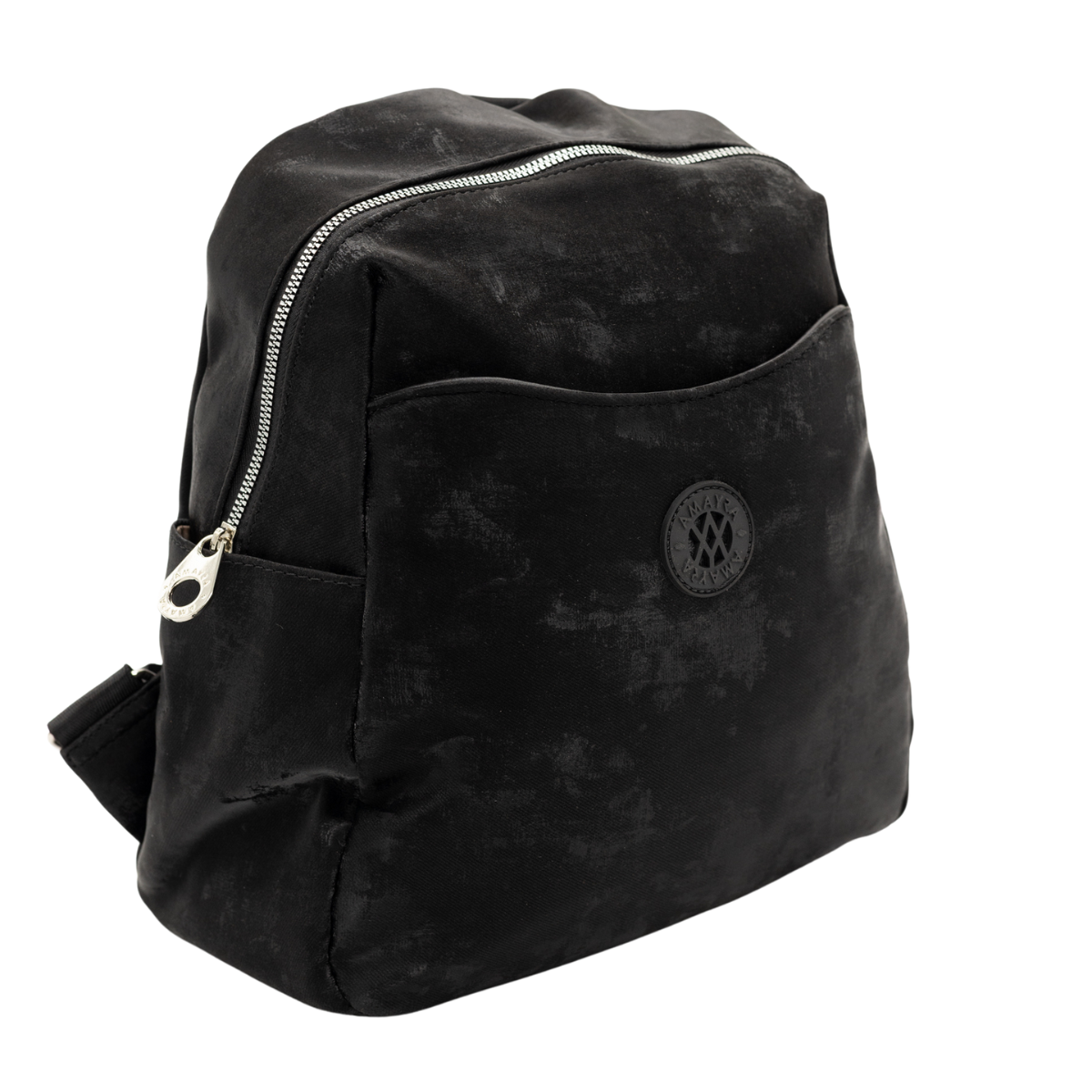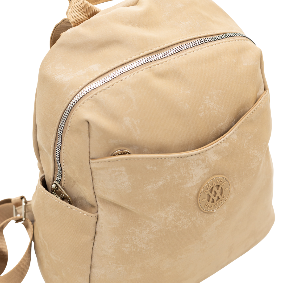 Mochila con amplio compartimento principal con cierre superior, bolsillo frontal exterior, dos bolsillos laterales abiertos. Las correas ajustables y el asa superior permiten llevarla cómodamente al hombro o en la mano. Diseño moderno con acabado efecto aterciopelado y textura metalizada suave. Su estructura liviana y práctica la hace ideal para uso diario.